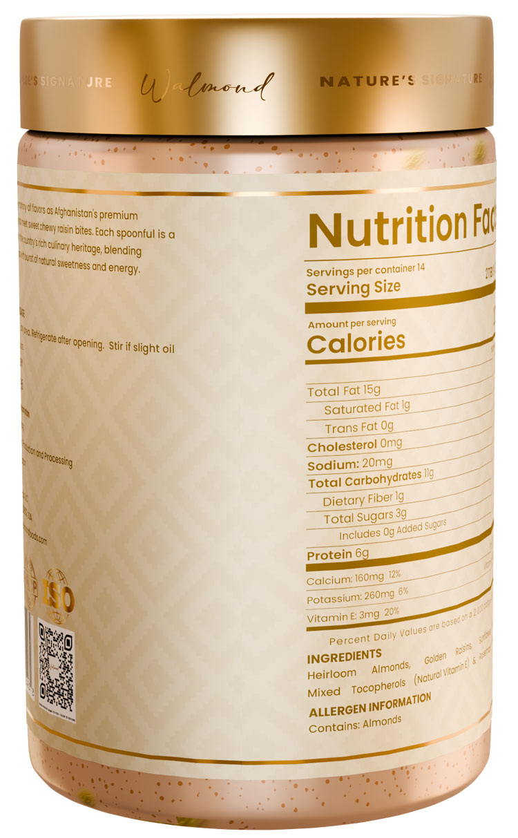 A creamy almond butter made with whole sun-dried raisins for natural sweetness. Smooth in texture with soft raisin bites throughout. Made in small batches with no sugar added and no palm oil. Perfect for spreading, topping, mixing and enjoying as a wholesome snack.